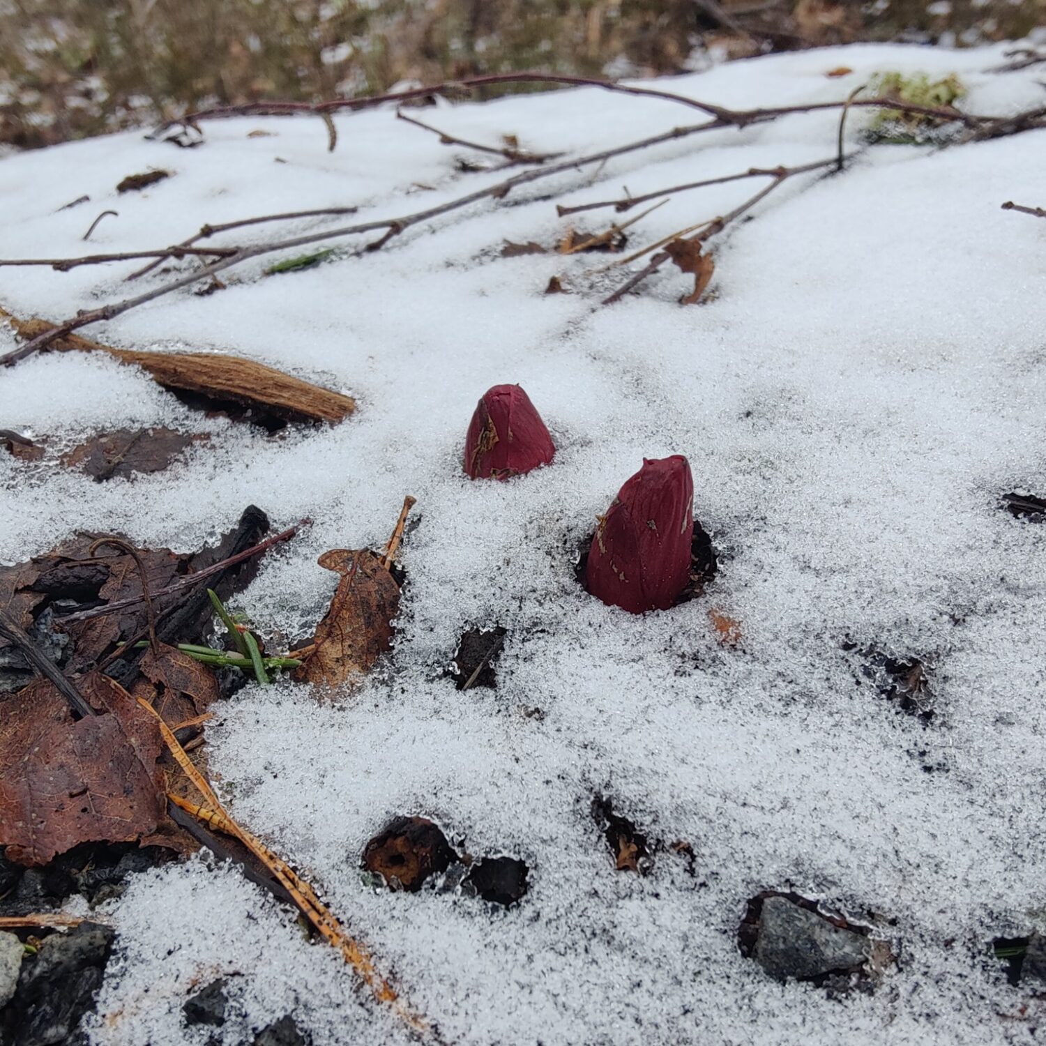 Pidempi leutokausi on saanut Kuolanpionien ja Kaukasianpionien kärjet jo nousemaan. Tänään nekin ovat armeliaasti lumen peitossa. Kalenteri kertoo kevään jo olevan lähellä, tänään ei vain oikein siltä tunnu.
